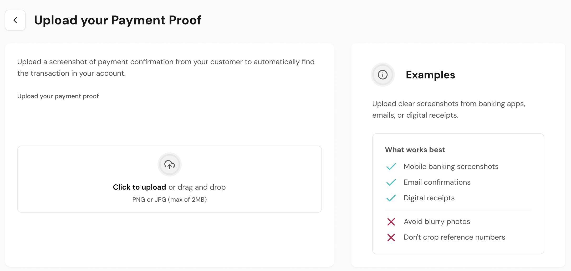 Can't locate a customer's payment in your account? Upload their payment confirmation screenshot and we'll find it for you automatically.